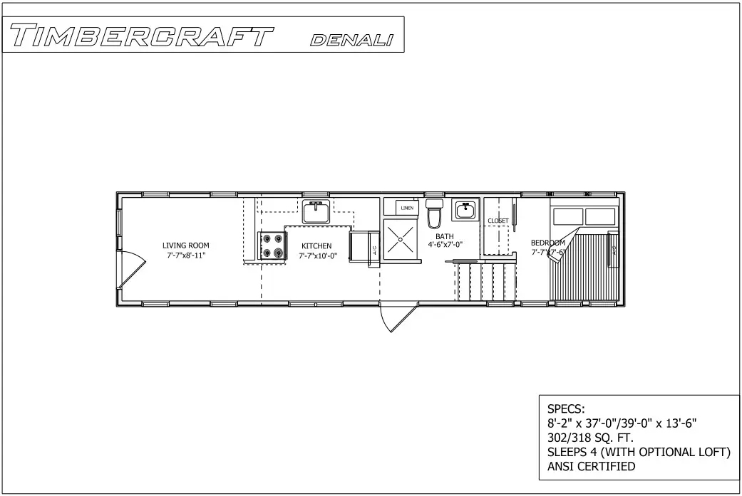 The Denali Tiny Home by Timbercraft Tiny Homes feels like a warm handshake from the world of small-space living—a place that welcomes you with open arms and a practical smile. Stretching 8′-2″ wide and 37′-0″ to 39′-0″ long, with a height of 13′-6″, this little gem offers 302 to 318 square feet of pure possibility. Certified by ANSI, it sleeps four comfortably, with an optional loft that bumps that number up for extra company. Having wandered through countless tiny homes over the years, I can’t help but grin at how the Denali turns limited space into a cozy, livable nook. It’s the sort of home that begs you to pack light and hit the road, built by folks who know how to make every corner count.