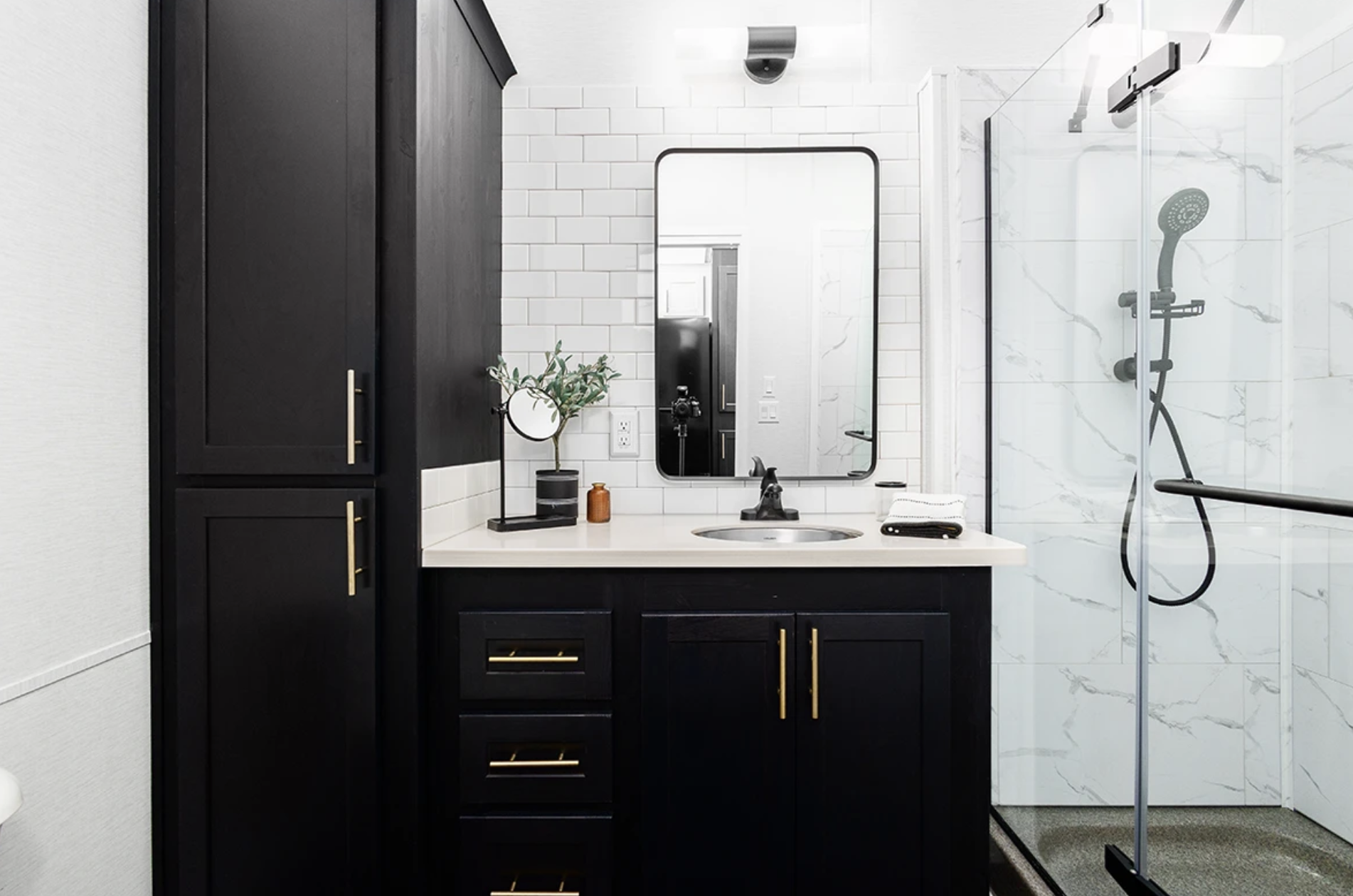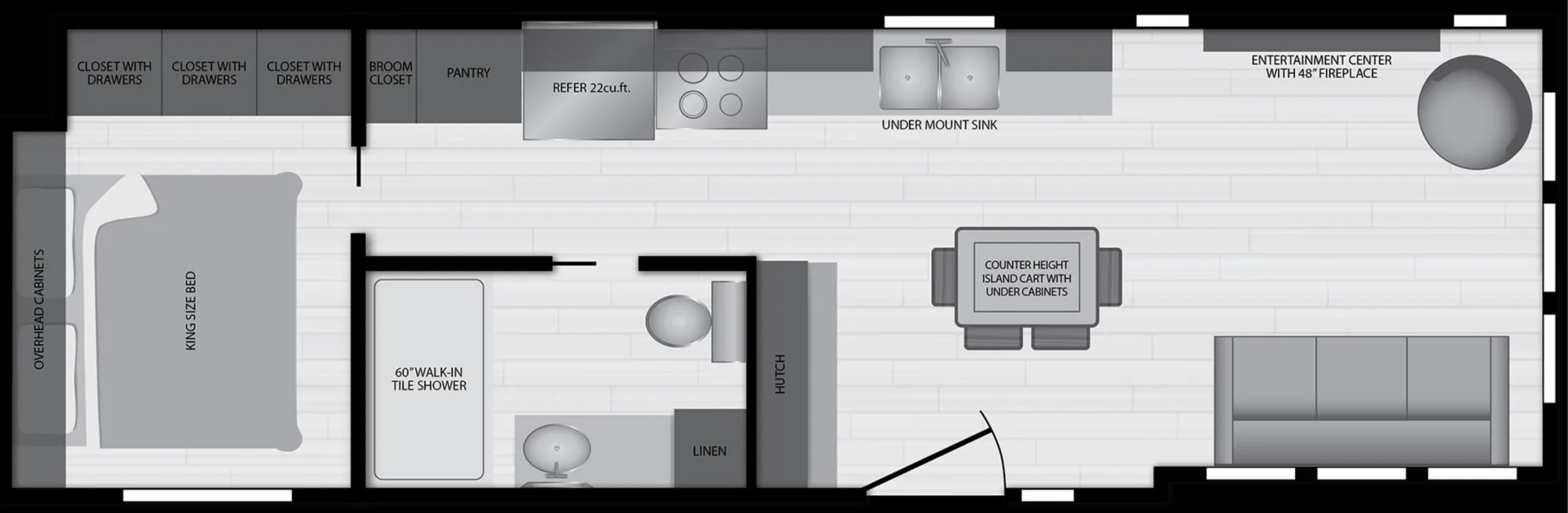 The interior of the Eldorado 9020 is a perfect example of attention-grabbing luxury. The structure is around a 48 inches fireplace which is the core of the open-plan area, the fireplace warming light being the attract point for the freezing nights. The tapered ceilings and shiplap walls for the features are the room/built-in unit enhancements while the wood blinds bring in nature’s light which lands on the cabin’s warm-textured surfaces. The living space, the furniture of which is made of leather, is connected directly and without any break to the modern kitchen which possesses; solid surface countertops, a full-height stone or tile backsplash, and a residential 22-cubic-foot refrigerator. The soft-close cabinetry and under-mount sinks which are the refinements of meal preparations sewn up in style and made efficient, be it you are making fast breakfast or giving a small dinner-party.
