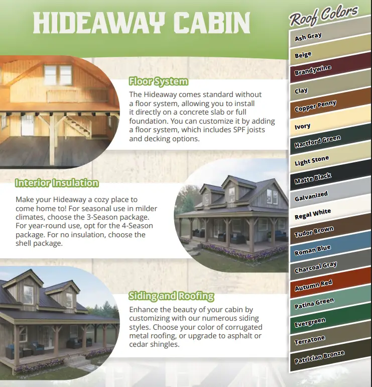 Owning a Hideaway involves considering its place within its landscape. The 32×38 size fits wooded retreats, lakeside properties, or rural backyards, requiring a level site and foundation, with delivery details tailored to the 200-mile radius. The unfinished interior calls for planning utilities and finishes, influenced by local climate, with the surrounding nature providing a backdrop for a life lived close to the earth. The prices—ranging from $61,618 for the Frame Only Kit to $124,017 for the 4-Season model—reflect a range of investment levels, guided by Jamaica Cottage Shop’s expertise in customization and support.