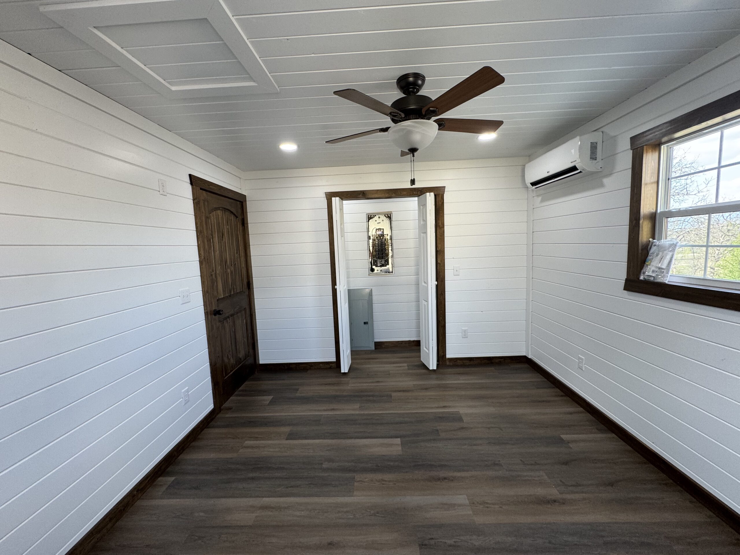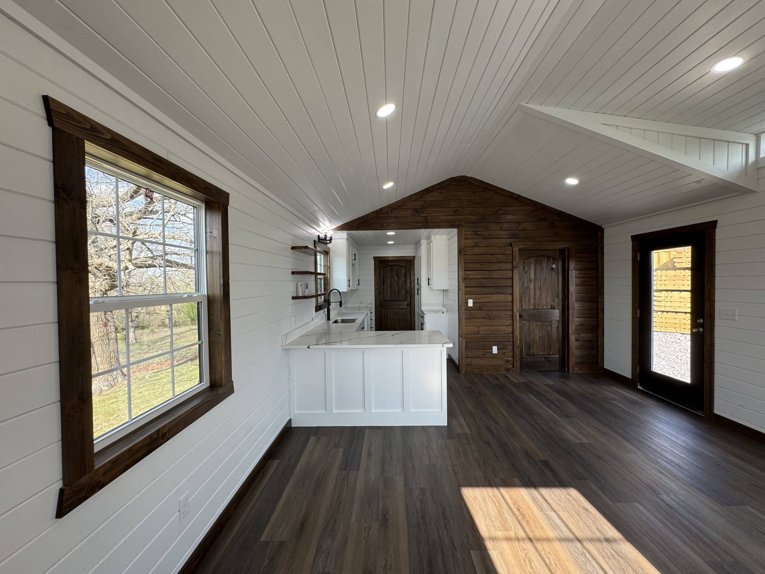 Inside, the fully finished interior unfolds with a warmth that feels handcrafted, the 640 square feet divided into a living room, kitchen, bedroom, and bath that flow with an ease that’s hard to beat. The living room opens up with space for a sofa and chair, the windows pouring in light that highlights the wood tones, making the room feel bright and airy. The kitchen, adjacent, is a practical heart, with counters for prep and a sink under a window that frames the view, the cabinets holding just what you need for meals that taste of the land. The bedroom offers a restful escape, the bath a simple yet comfortable spot with a shower and vanity, the layout keeping things private without closing off the home’s openness. This finished state means you can move in and make it yours, the beauty in the way it balances function with a touch of elegance.