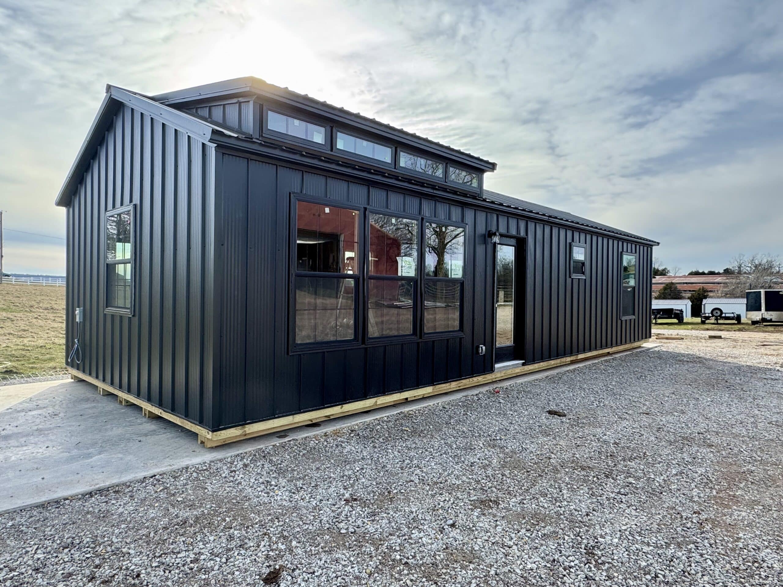 The exterior catches the eye with its matte black finish, the roof and trim giving it a bold silhouette against the Ozark hills, the 16×40 footprint a balanced canvas that’s neither too small nor overwhelming. The walls, in that same deep black, create a striking contrast with the windows, their frames letting in the light like spotlights on a stage. Ozark Premier Buildings has crafted this cabin with a focus on detail, the metal roof promising durability against rain or snow, the siding a shield that weathers gracefully. It’s the sort of place that fits into a wooded clearing or open meadow, the windows offering views that make the inside feel part of the outside, a beauty that’s as much in the build as in the setting it calls home.