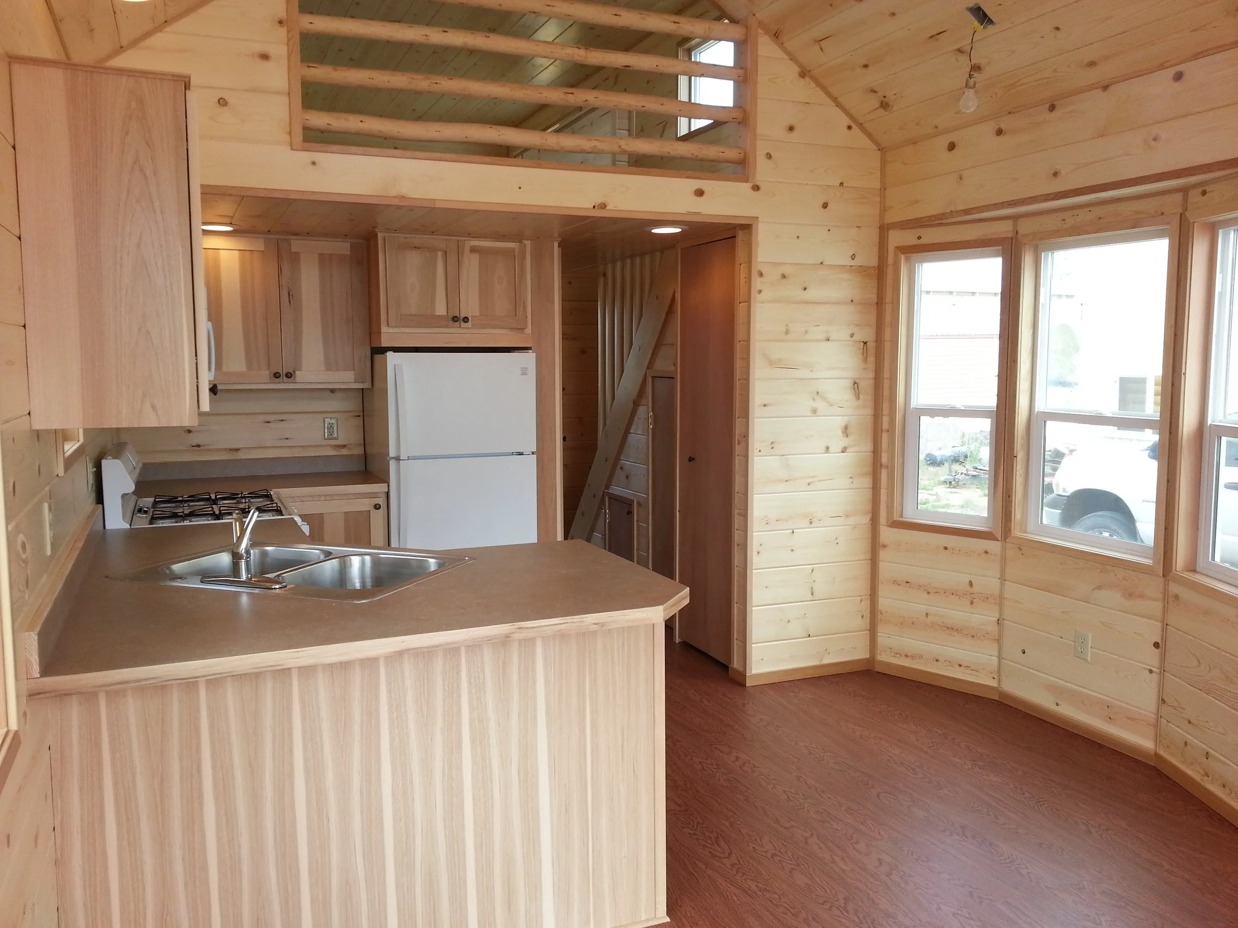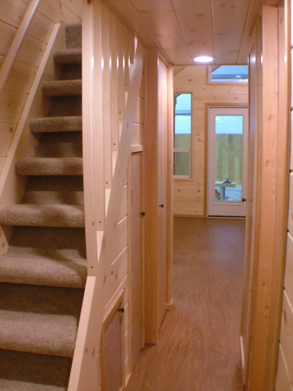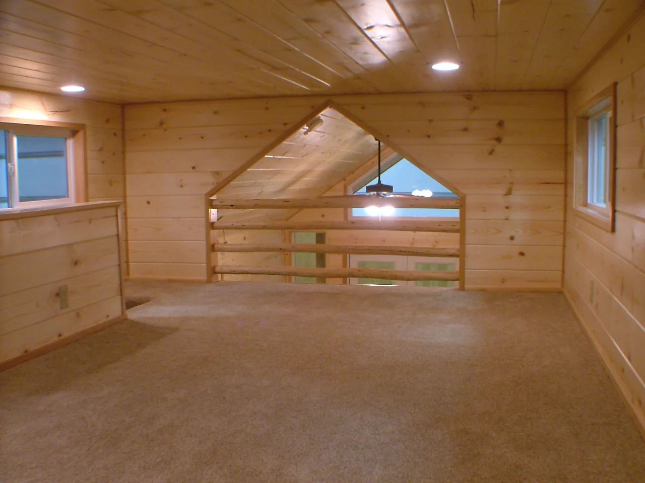 The interior layout unfolds with a practicality that surprises for its size, the 396 square feet on the main level covered in durable laminate flooring, its smooth surface warmed by R-19 floor insulation and 2×6 joists spaced 16” on center. The loft, carpeted and accessible by stairs, offers 216 square feet of additional space, the 4’6” headroom providing a cozy nook for sleeping or storage, the R-30 ceiling insulation ensuring year-round comfort. The wood interior, with its hickory cabinets and Oregon-style trim coated in two layers of lacquer, creates a warm ambiance, the recessed lighting and ceiling fan in the living room casting a soft glow over the space. The galley-style kitchen flows into this area, its laminate countertops and generous storage offering room to prepare meals, the 30” gas or electric range and 14.4 cf fridge ready for hearty cooking, the range hood keeping the air fresh. The 60×32” fiberglass tub/shower in the bathroom adds a spacious touch, the electric heat spreading warmth across the 11’6” width.