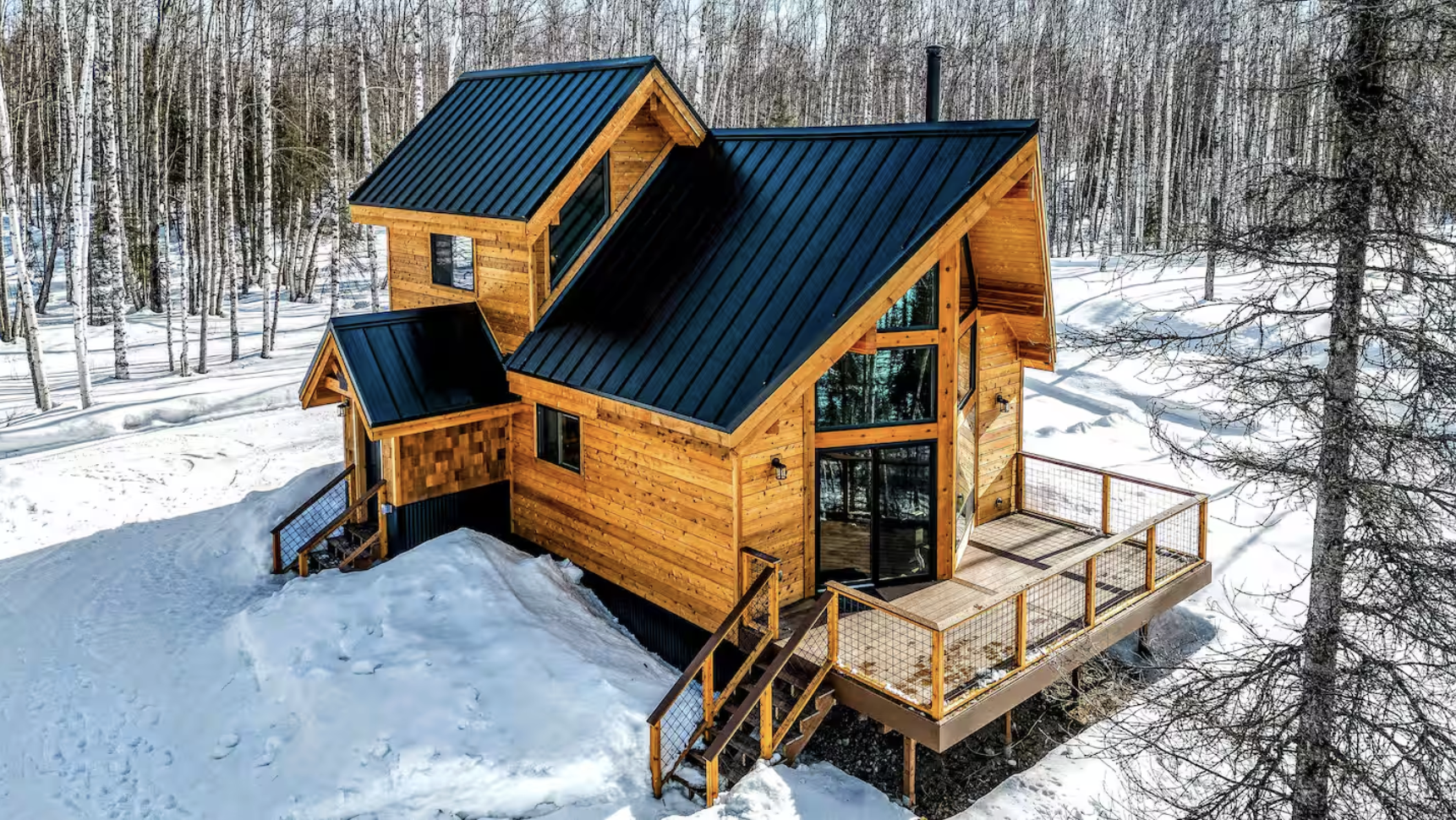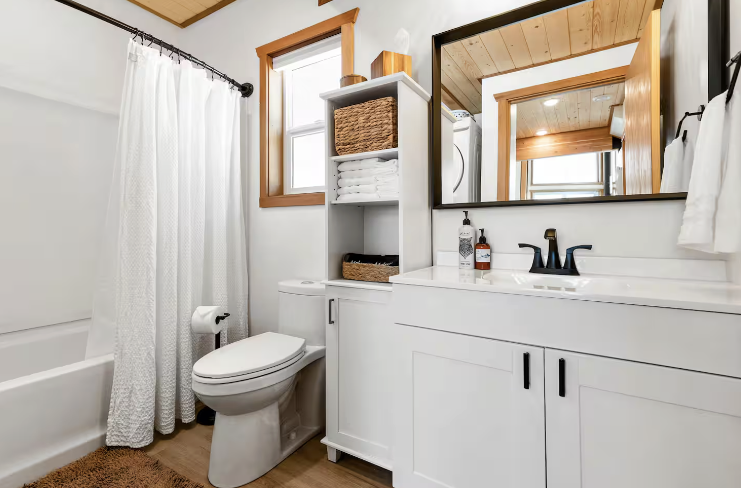 The bathroom completes this retreat with a touch of luxury, its hot shower a cleansing embrace after a day on the trails, the linens provided a thoughtful detail. The single-lever faucet gleams with modern ease, the mirror reflecting the soft light that spills in, the tiles a cool contrast to the wood’s warmth. This space, though compact, offers a daily renewal, its beauty in the simplicity of a warm shower and the quiet reflection it invites amidst the forest’s hush.