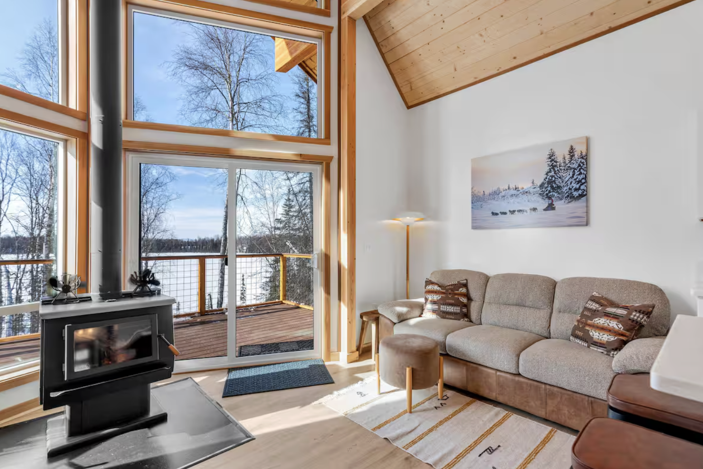 The living area flows with a gentle warmth, the wood-burning fireplace its beating heart, its flames casting a golden dance across the room. The recliner loveseat, plush and inviting, becomes a nest for reading or dozing, the Smart TV a discreet companion for quiet nights, its screen a window to distant tales. The air conditioning hums softly in summer, the heating wraps around in winter, maintaining a balance that feels like a gift in this wooden embrace. This space, with its large windows letting in the forest’s light, offers a beauty in its unassuming comfort, a place where the crackle of the fire blends with the wind’s song, fostering moments of stillness or shared laughter.