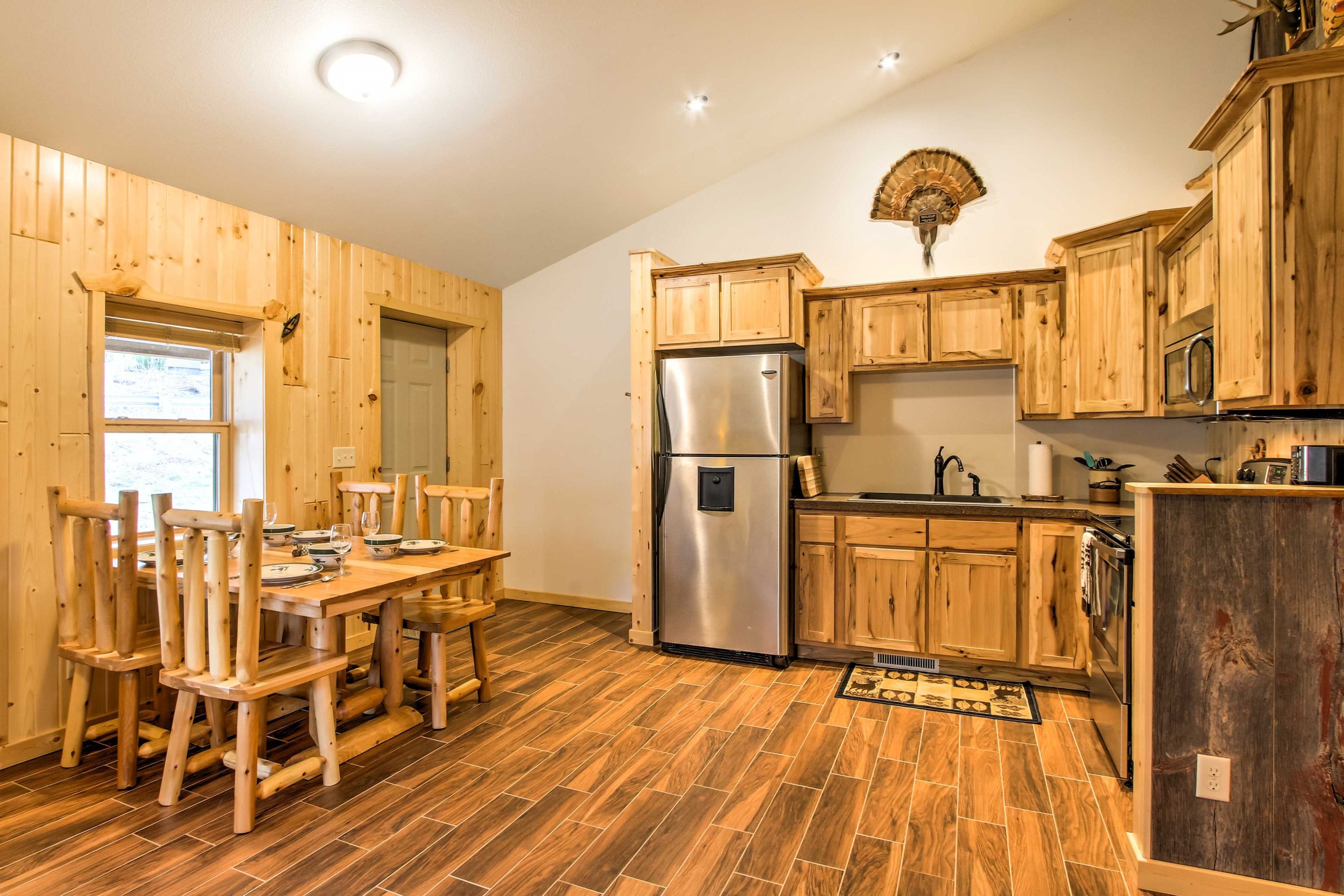 The cabin exterior will undoubtedly win your heart with its authentic rustic charm. The log siding has a warm and inviting glow when it catches some sunlight, a nice looking porch that runs almost the entire length of the house faces the front, it is perfect for putting rocking chairs out and having your coffee while the morning sun peeps through the trees.