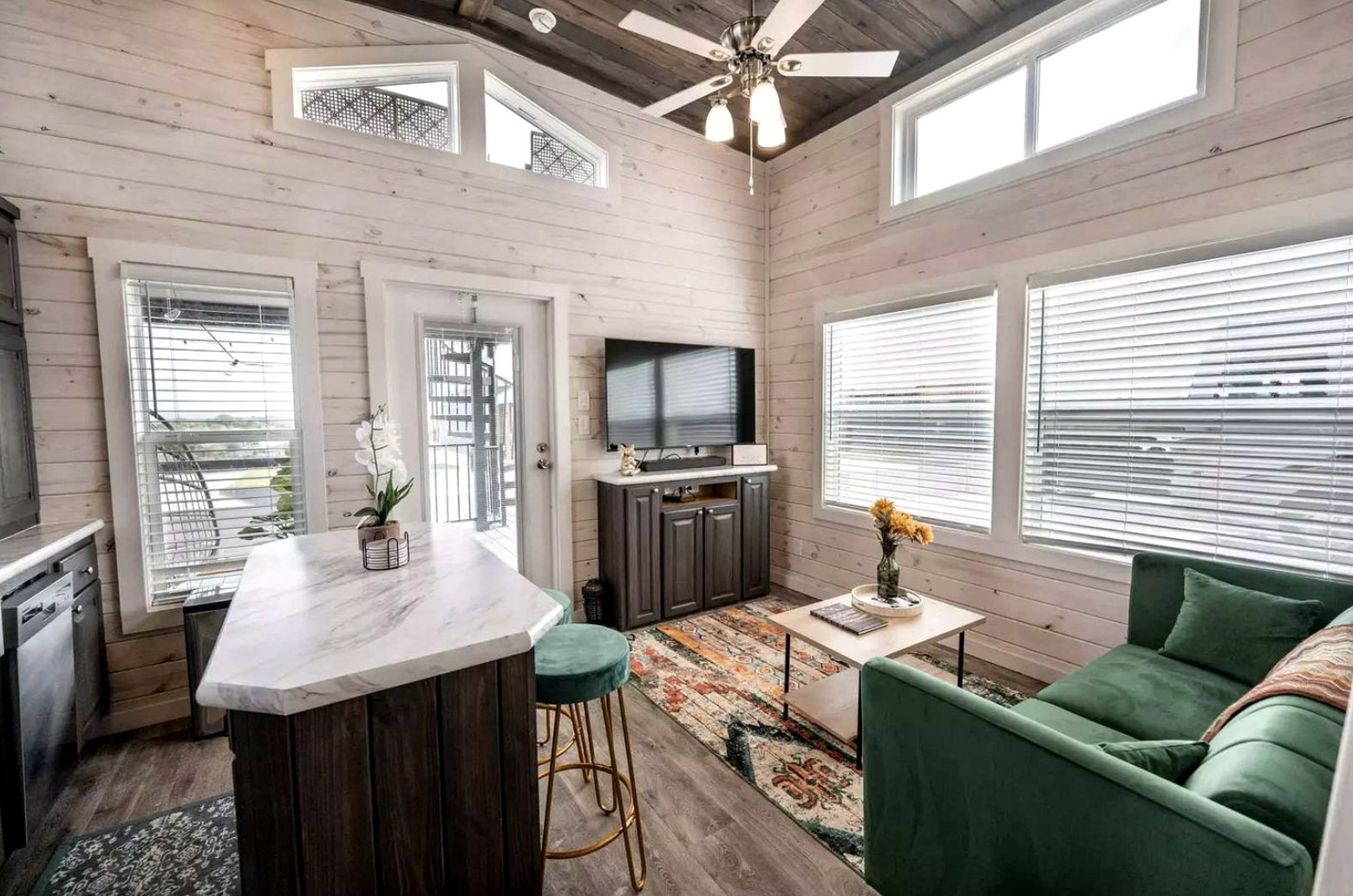 Located in the beautiful Texas Hill Country region close to Fredericksburg, this tiny house is a gorgeous example of modern cabin styling with a twist. It is meant to host a maximum of six visitors and combines a cozy, functional, and stylish living space with top-of-the-line outdoor facilities to ensure an unforgettable holiday. Besides the rooftop deck, the tiny house offers resort-style pool access and quiet nature spots, making it a destination that appeals to both those who want to relax and those who wish to reconnect.