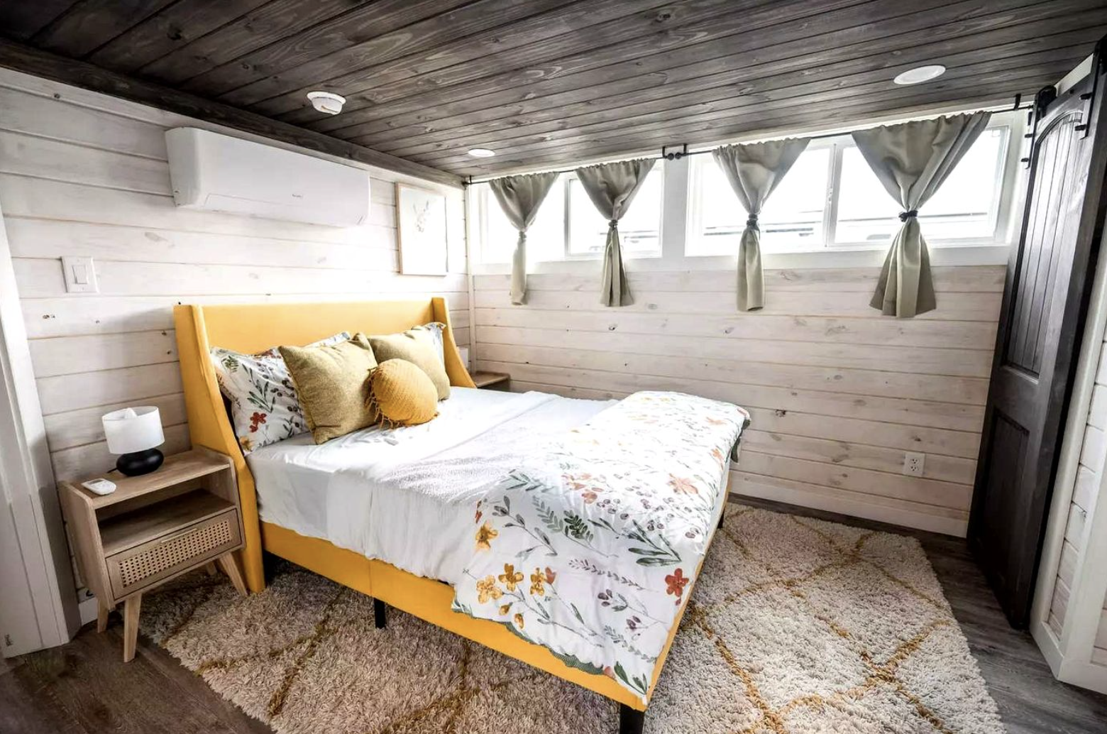 On the exterior, the tiny house stands out as a clean-lined, contemporary cabin. The combination of sleek modern form and rustic textures results in a very attractive building that complements the natural landscape very well. The designers’ choice of earthy colors and materials allows the house to blend into its surroundings, while the extensive fenestration invites natural light and offers vistas of the delightful countryside. This interplay of modernity and nature facilitates a luxurious yet earthy feel for the cabin.