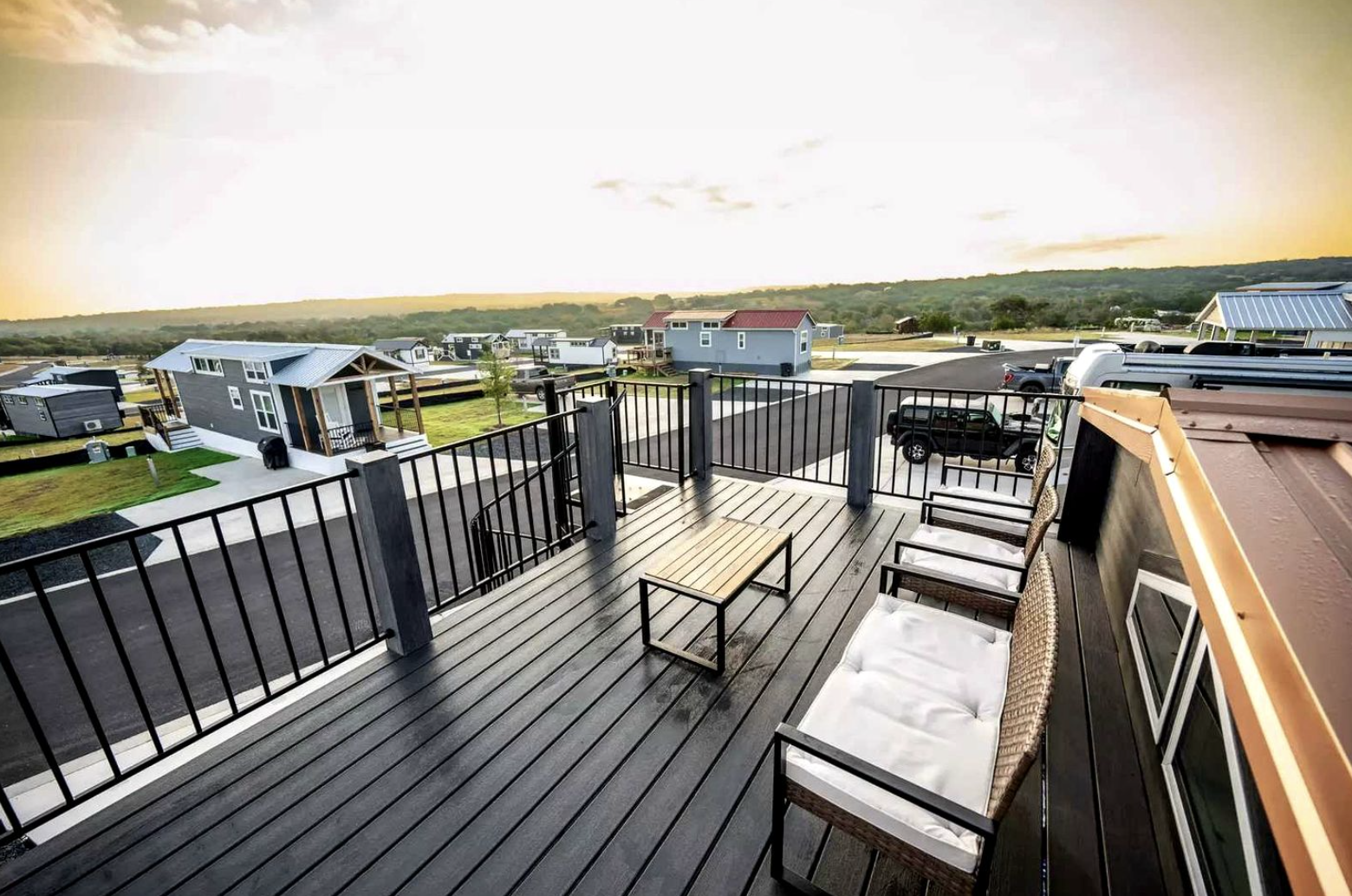 The rooftop deck is a unique and spectacular feature of this tiny house, adding a new dimension to the outdoor experience. The breathtaking views of the hills and vineyards provide a wonderful backdrop for breakfast, ending the day with a glass of wine, or just enjoying the Universe above. The porch and patio furniture complete the picture, giving several options for outdoor relaxation. The whole exterior design inspires outdoor living, which is a major attraction of the Texas Hill Country lifestyle.