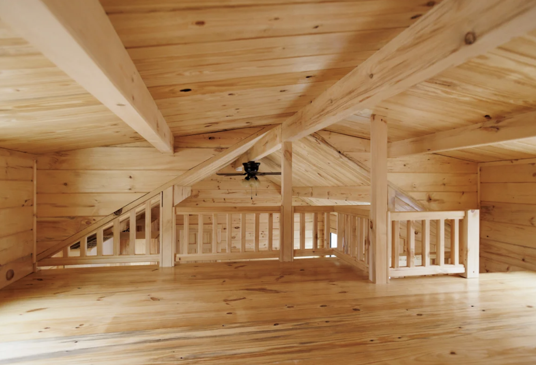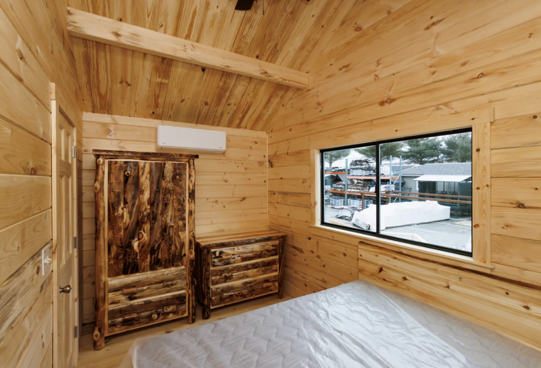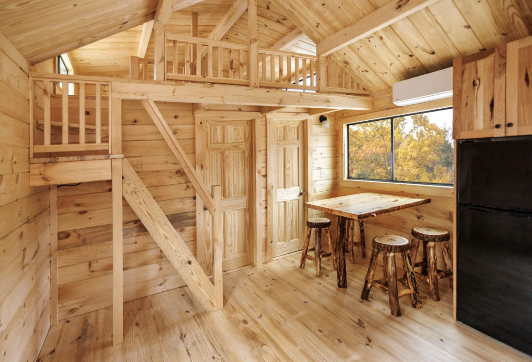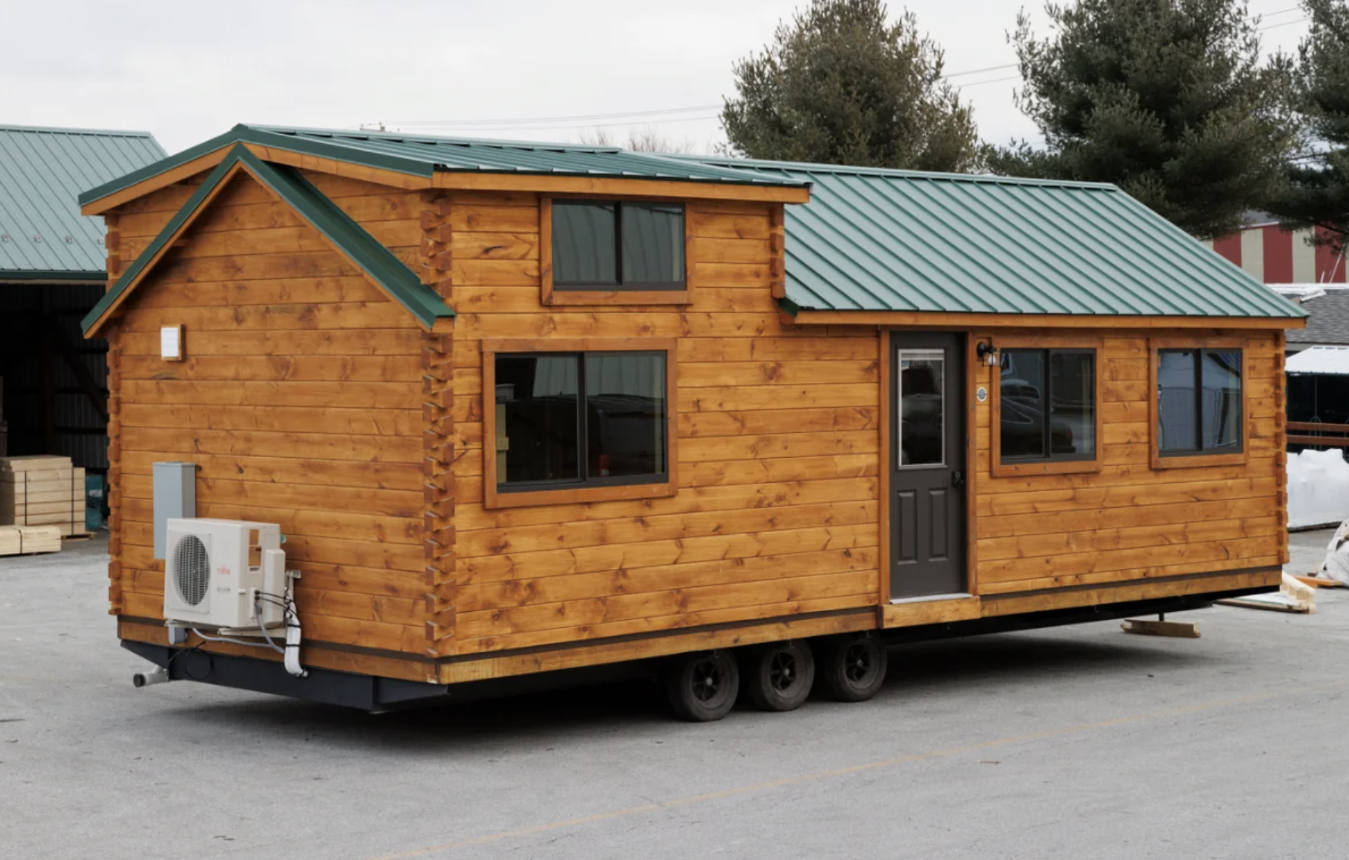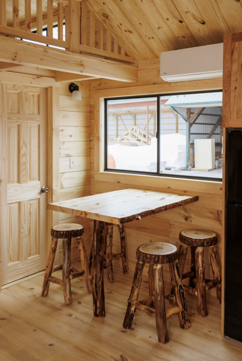 In the winter, the small size really helps as it is much simpler and less costly to heat than bigger buildings, while the thick logs, spray foam insulation, and Carrier mini-split HVAC keep the indoor environment comfortable year-round.