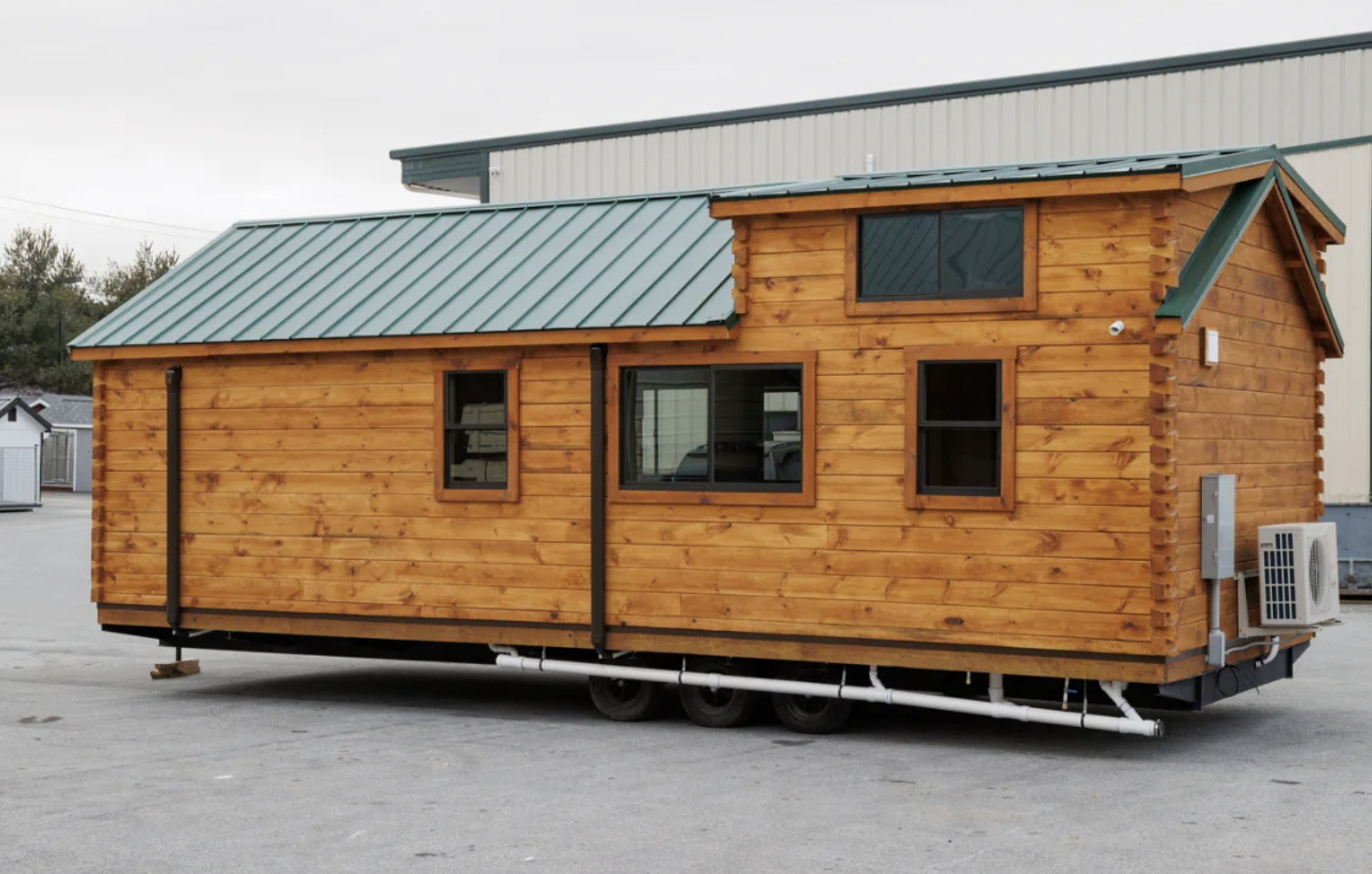 The standing-seam metal roof in textured evergreen color keeps the cabin well protected and adds a soft shade of green, while the matching green gutters, downspouts, and skirting not only cover up the trailer base but also give a solid, site-built look. To summarize, the level of finish and the quality of the materials and craftsmanship are a far cry from what you usually get with mobile or tiny homes.