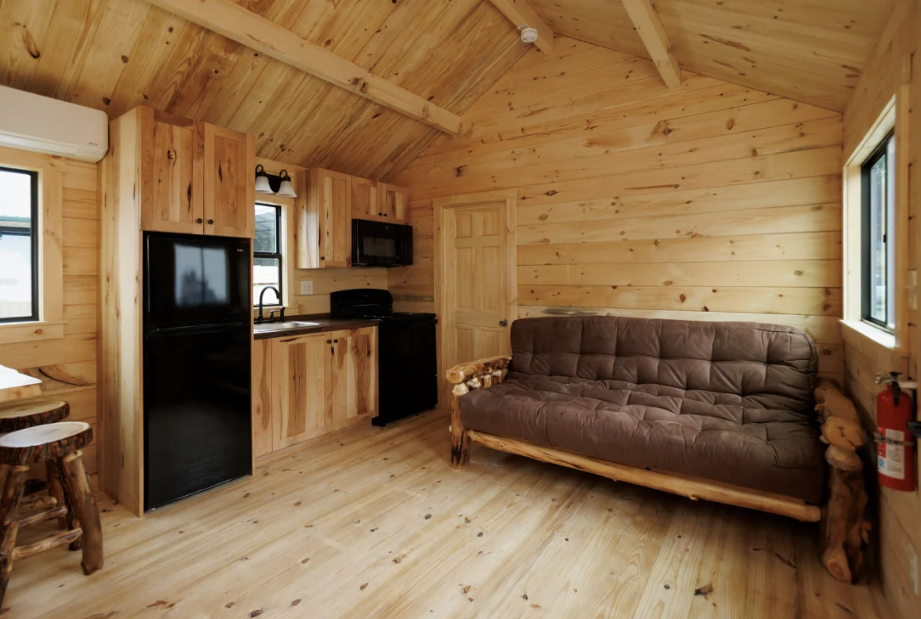 On the other hand, the kitchen, while small, has a well thought-out and functional layout. Solid hickory cabinetry complemented by matching countertops and backsplash provide generous work surface and storage, while the open layout maintains the connection between kitchen and living space. It is equipped with a full-size fridge, an electric range/oven, a microwave mounted above the range, and a sink with an oil-rubbed bronze faucet. It is a perfect kitchen where you can make anything from a quick breakfast to elaborate dinners. The kitchen is fully equipped and ready to go, which means the cabin is very practical for overnight stays or long vacations.