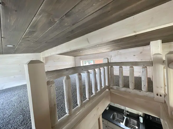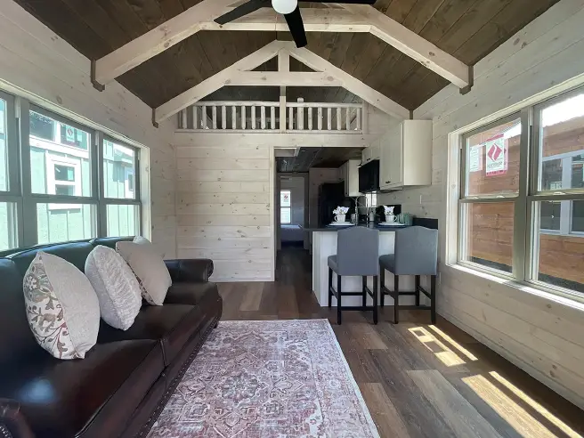 In addition to that, a 65-inch TV with surround sound can be used turning the living room into a mini-theater for movie nights, while the smart thermostat helps with achieving desired comfort level without any trouble. It’s a place where the tiny things lead to something bigger—the banjo counter being space-saving yet style being kept, the built-in storage being used for keeping the area neat, the loft railing offering safety along with a view. The incompletely done items inside such as optional wooden blinds or leather upholstery provide a chance for personalization thus making the Lincoln your cabin from day one.