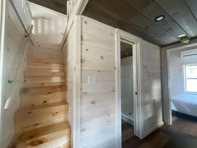 The bedroom with its built-in closet and dresser is a peaceful refuge; the king-size bed (or loft arrangement) covered with linens that are inviting and suitable for a nap after a day full of activities. The bathroom with banjo countertop over the toilet and large walk-in shower can be identified as a small luxury spa where tile work done in soft neutral keeps the whole thing clean and calm. On top of that, a ladder leads to a loft where the number of sleepers is extended up to six, meanwhile, beneath the “Doggie” room, which offers a brilliant hiding place for furry friends or additional gear is turning what could be simply wasted space into something wonderfully useful.