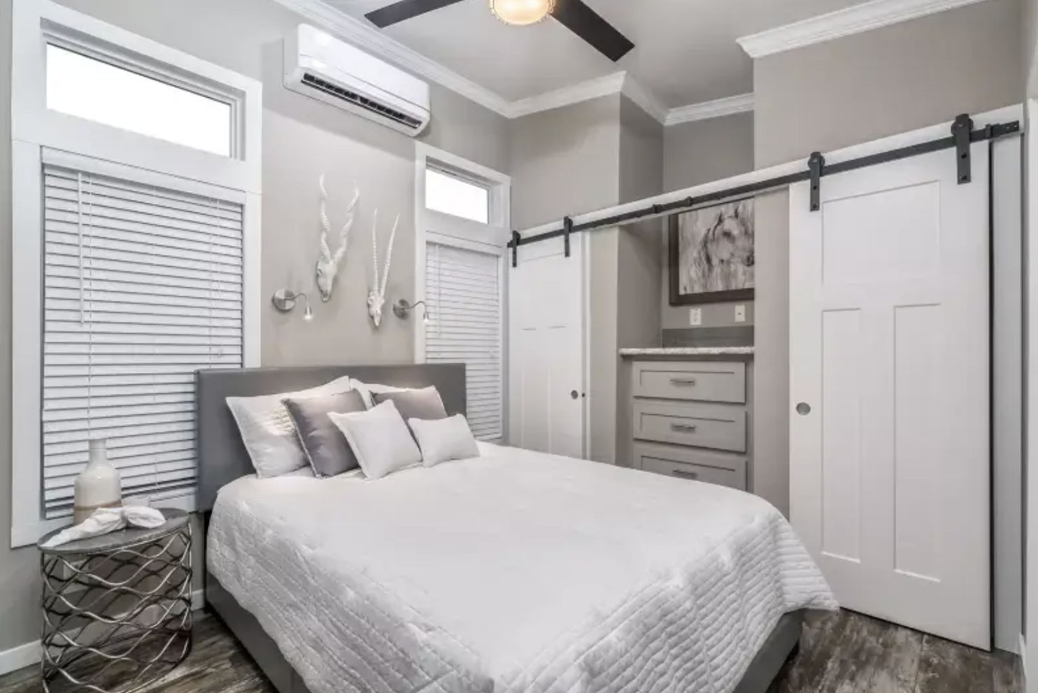 The bedroom on the ground floor is a calm retreat, it has a queen-size bed and, most importantly, dual sliding barn-door closets which give a lot of storage space without the need for the floor area. These nice doors give the bedroom a rustic style while working perfectly: daily access by sliding one open, keeping the other closed for hiding season items, or opening both for the full walk-in closet effect.
