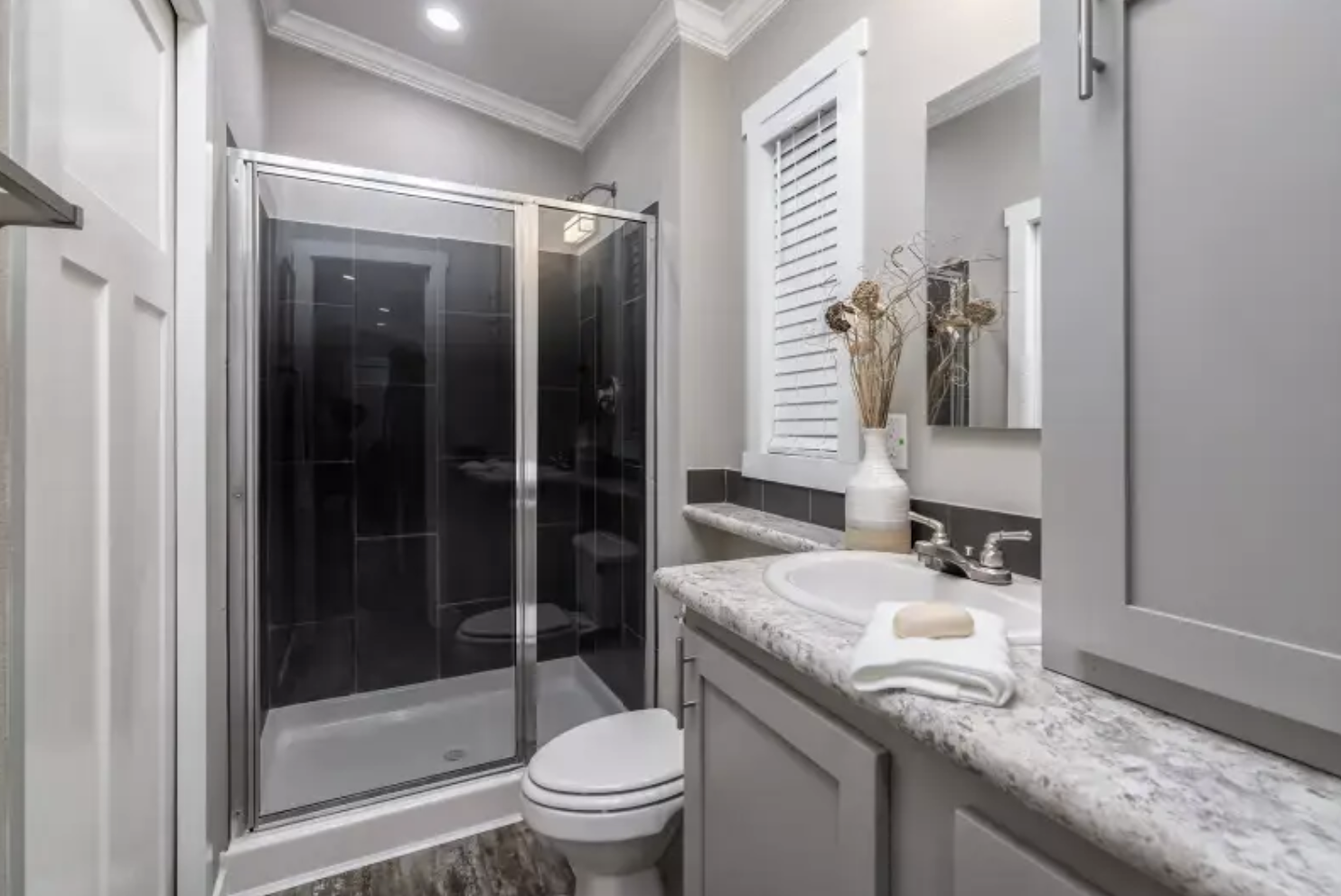 The bathroom is the highlight of the Waterloo tiny house. A glass-walled walk-in spa shower with modern tile, a rainfall showerhead, and a built-in niche is something that takes the daily routine to a moment of delight. There is no cramped tub-shower combo here—just pure, clean luxury.