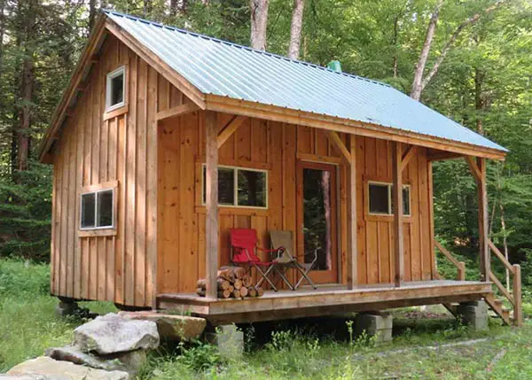 The exterior of the Vermont Cottage A sets a welcoming tone, its 4-foot porch stretching along the bearing wall, a perfect spot to sit with a book or watch the seasons change. The gable roof, with its steep pitch, not only adds architectural interest but also provides shelter, its design echoing the traditional cottages of rural landscapes. The high ceilings inside lift the spirit, the loft at one end offering a cozy nook for sleeping or storage, its ladder adding a touch of rustic charm. This combination of form and function creates a space that feels alive, the unfinished interior a canvas for personal expression, where the wood’s natural grain hints at the stories of the trees it once was.